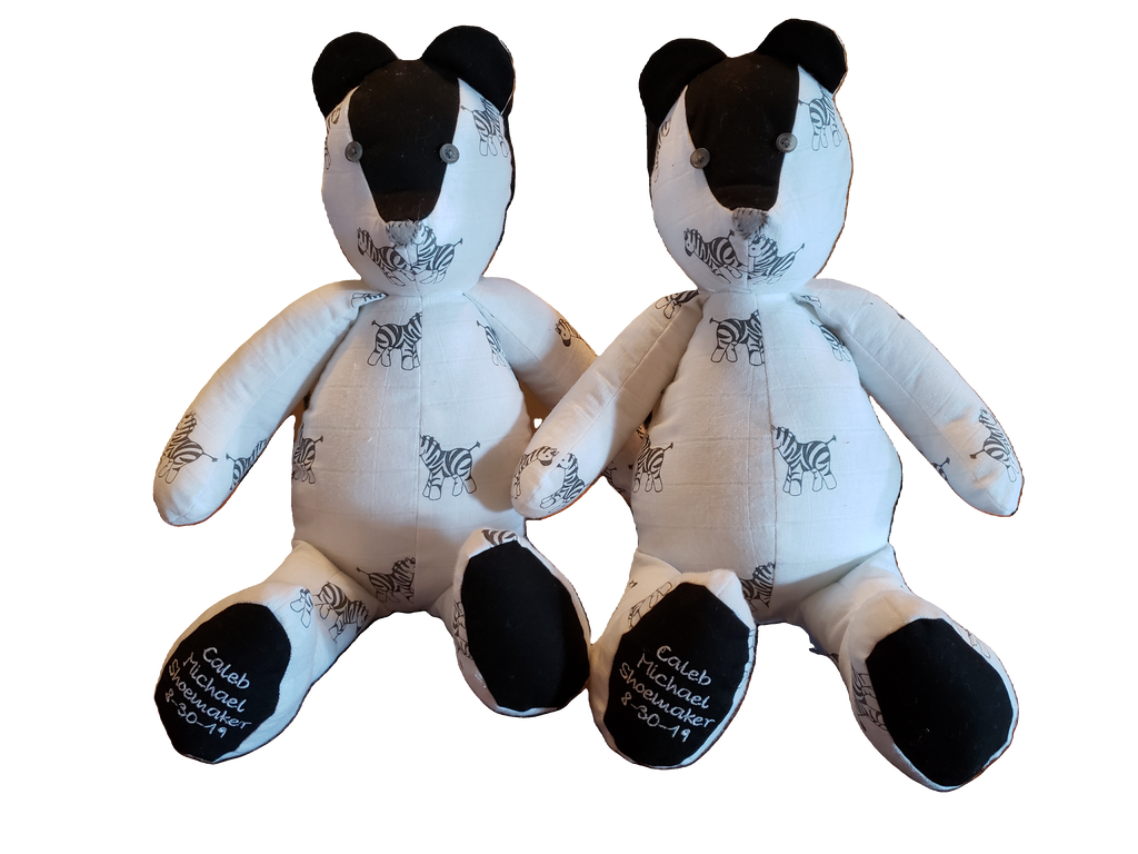 Honor the memory of a baby lost during pregnancy, at birth, or shortly after with a handcrafted 18" bereavement memory bear. This keepsake bear, made from a baby’s outfit, swaddle blanket, or special clothing item, provides a tangible comfort for grieving parents, grandparents, or family members. While nothing can replace the little one lost, a memory bear allows families to hold onto the love and memory of their baby.