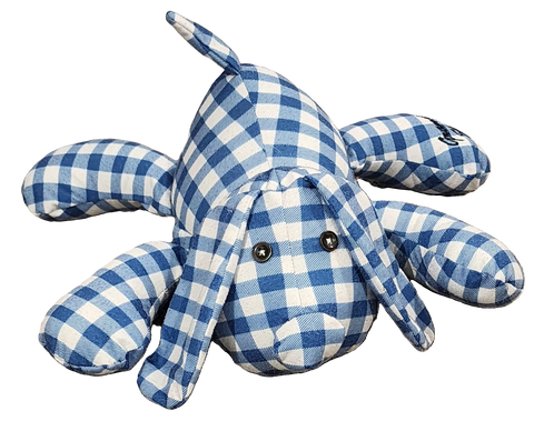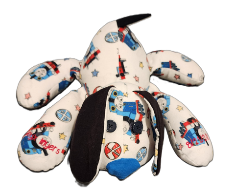 The memory puppy sprawls out to approximately 18” wide when finished, giving it a soft, cuddly presence that feels natural to hold, rest on a bed, or display in a special place. It can be made from a variety of meaningful garments such as shirts, pajamas, baby clothes, blankets, or other sewable fabrics.
